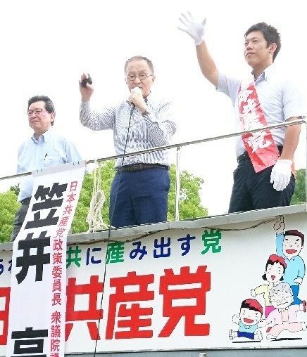 日本共産党の笠井亮政策委員長・衆院議員は11日、香川県丸亀市の丸亀城前と高松市の瓦町駅前で田辺健一参院比例候補と演説し、「市民と野党の力で“アベ政治さよなら、新しい日本こんにちは”の一歩を香川から生み出そう」と呼びかけました。